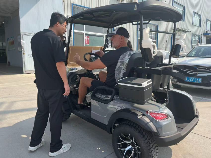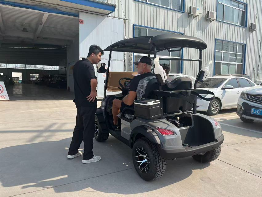 Under the warm afternoon sun, the client took a test drive in our two-seater electric golf cart. They experienced the smooth acceleration, precise braking, and stability of our MacPherson and double-wishbone suspension systems. After the drive, they smiled and said, “This is exactly the driving feel we wanted!”
